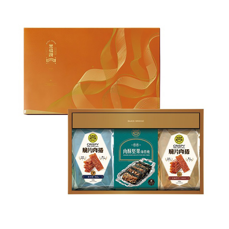內容物:芝麻杏仁脆片肉捲(70g)+黑胡椒杏仁脆片肉捲(70g)+肉酥堅果海苔燒(60g)