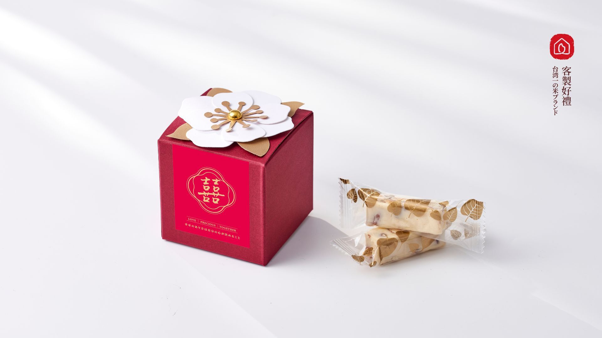 牛奶牛軋糖以及最應景的花型禮物盒,最適合作為結婚喜糖桌上禮,讓每位賓客都嚐到新人專屬的甜美祝福,米香糖意,喜事滿滿~